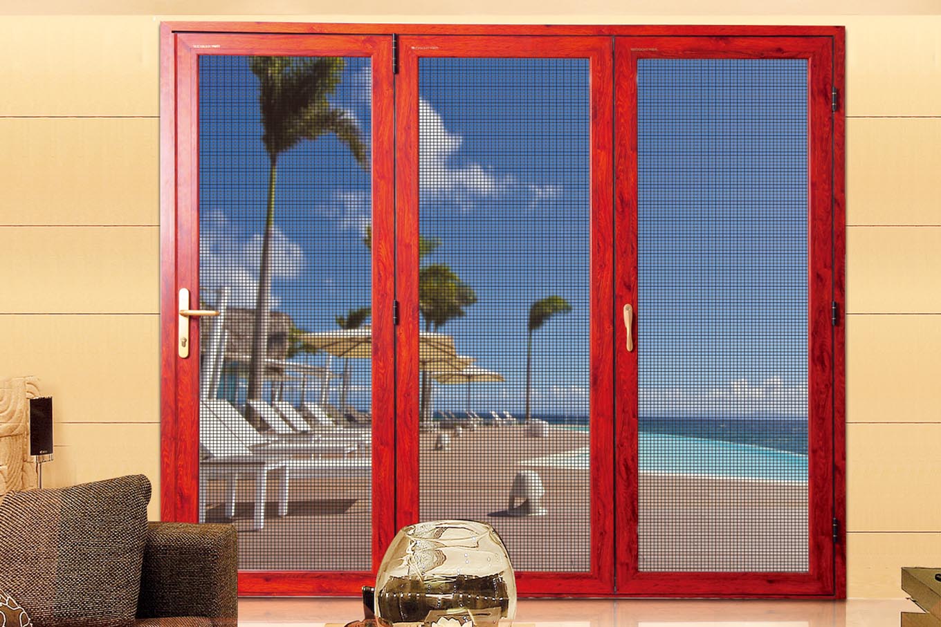 在保證結(jié)構(gòu)強度的條件下,滿足結(jié)構(gòu)合理,造型美觀。推拉折疊紗門的外漏安裝孔采用裝飾條封閉,達到外觀整潔美觀。