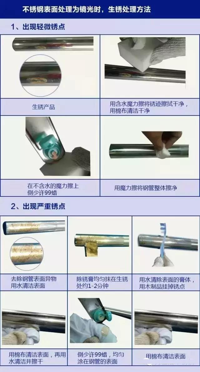 以上情況均可造成不銹鋼表面防護(hù)膜的破壞引發(fā)銹蝕。所以,為確保金屬表面永久光亮,不被銹蝕,我們建議: